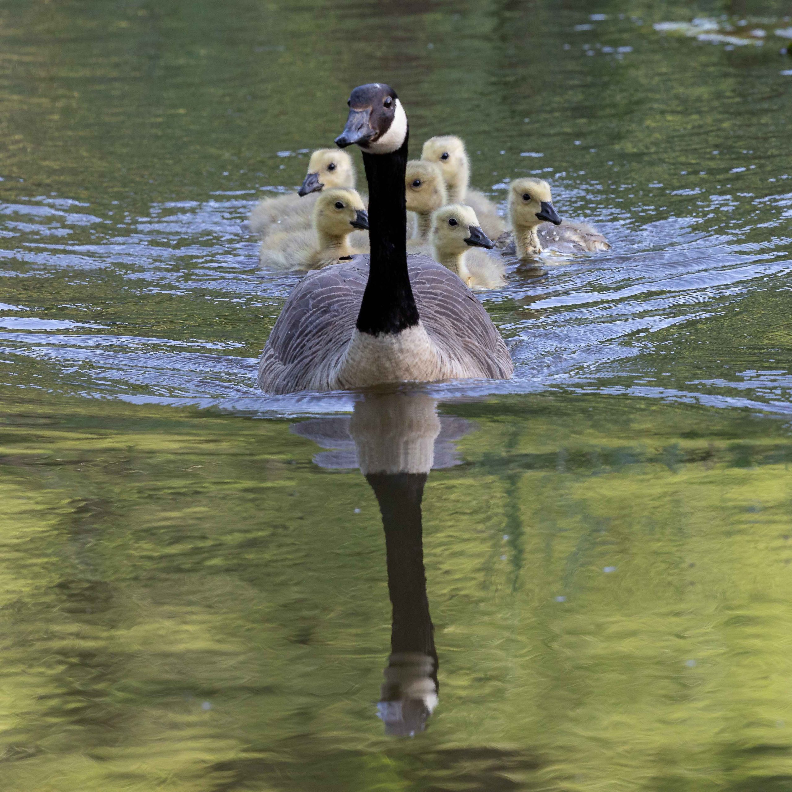 A Canada goose leading her goslings along a small tributary of the River Stour